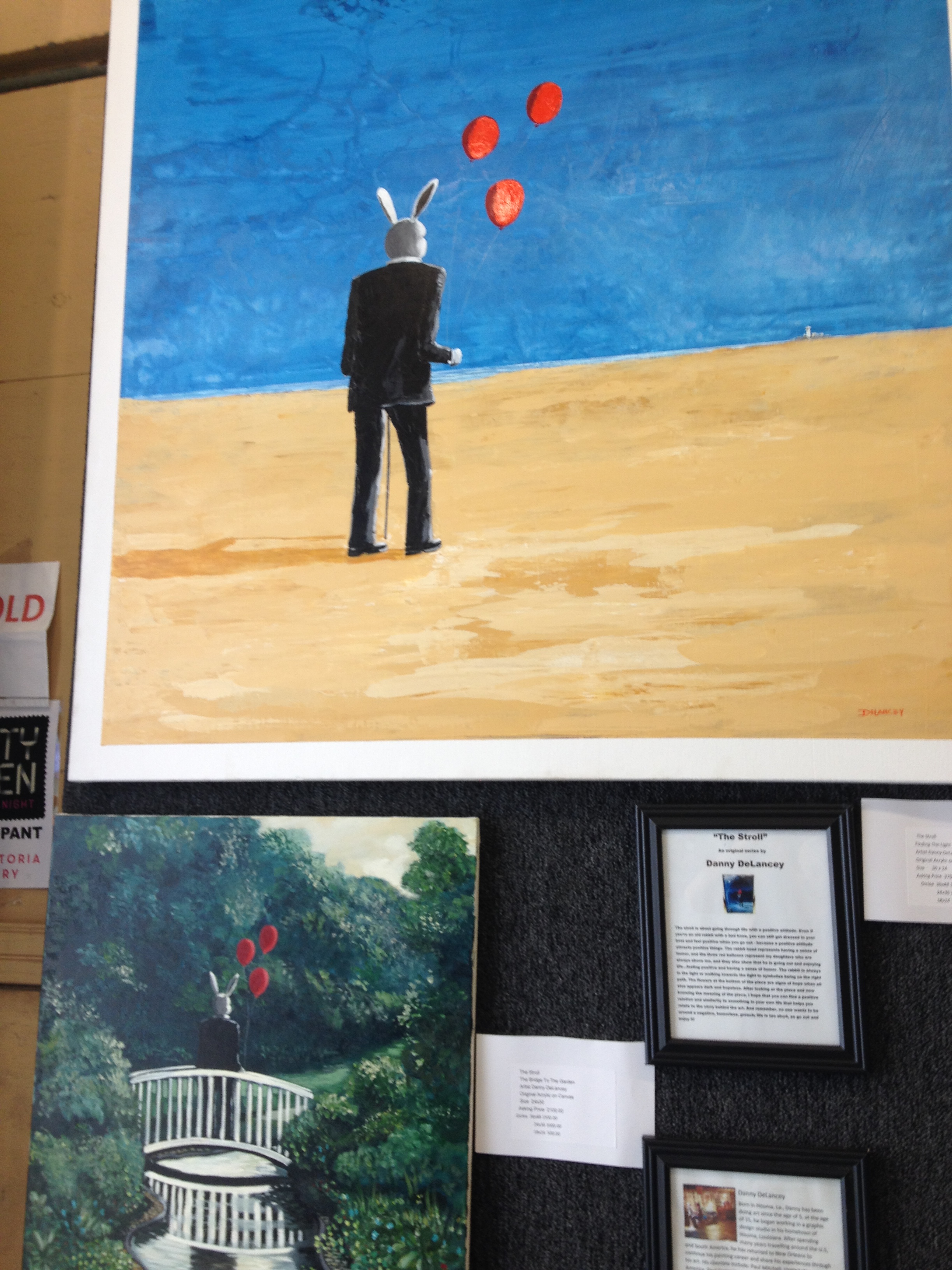 Feeling considerably more sober while contemplating Tom’s comments I hug my newly purchased artwork, Wolf Whistle II (by Zac Franzoni) to my chest and trudge up the metal stairs towards the the outbound train.